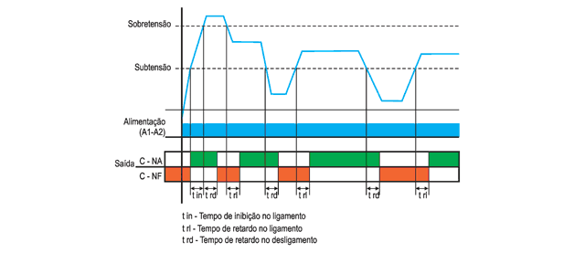 Com a rede monofásica ligada ao aparelho, o relé de saída do supervisor será energizado, inicia-se com tempo de inibição. Durante este tempo de inibição o relé verifica o nível de tensão em sua entrada. Caso o valor de alimentação diminua ou aumente até valores definidos, o relé de saída passará para o estado de repouso após o tempo de retardo no desligamento até que o nível de tensão restabeleça ao valor normal. Nesta condição o tempo de religamento é acionado.