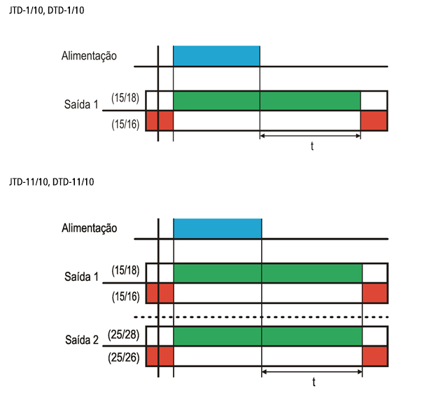 Os temporizadores comutam seus contatos de saída para a posição de trabalho após sua energização e retornam à posição de repouso após o intervalo de tempo (t) selecionado em sua escala contado a partir desenergização de sua alimentação (A1/A2) conforme diagramas abaixo.
