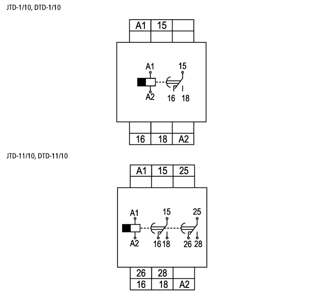 JTD-1/10, DTD-1/10: 1 x 5 A, 250 Vca máx. (carga resistiva) – reversível JTD-11/10, DTD-11/10: 2 x 5 A, 250 Vca máx. (carga resistiva) – reversível |