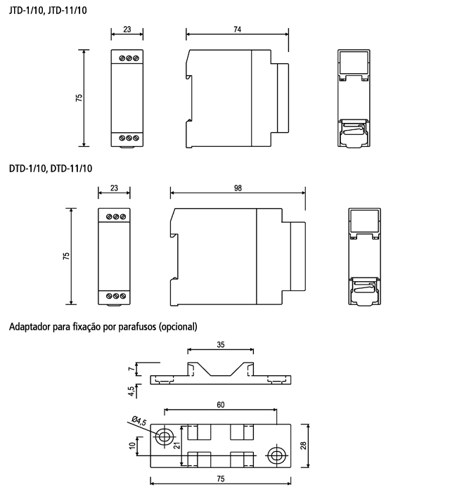 Trilho DIN 35 mm ou parafusos (mediante adaptador opcional) |