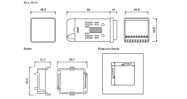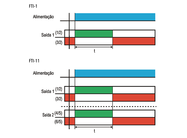 Os temporizadores comutam seus contatos de saída para a posição de trabalho quando o aparelho é energizado e retornam à posição de repouso após o intervalo de tempo (t) selecionado na escala frontal. Com opções de um (FTI-1) ou dois (FTI-11) contatos temporizados.