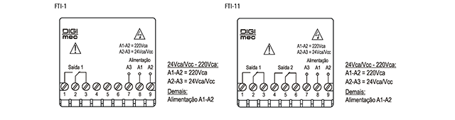 FTI-1: 1 x 5 A, 250 Vca máx. - reversível (carga resistiva) FTI-11: 2 x 5 A, 250 Vca máx. - reversível (carga resistiva) |