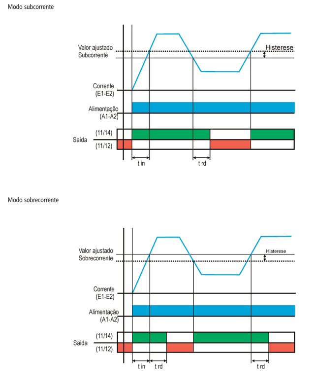 No modo de Subcorrente: ”Jumper” c – d = "FECHADO", ao energizar o aparelho o relé de saída é energizado e aguarda a estabilização da corrente, a qual deve ficar acima do valor ajustado no trimpot de corrente. Se a corrente cair para um valor abaixo do valor ajustado o relé é desenergizado após decorrido o tempo de retardo. Se a corrente voltar a subir o relé é energizado ao atingir o valor da histerese mais o valor ajustado.
