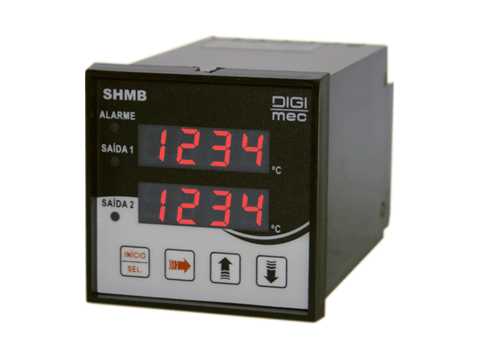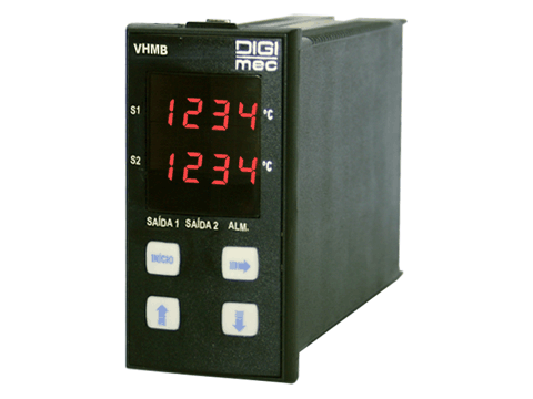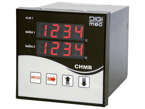 - Display: duplo display de 4 dígitos, um par para indicar a temperatura de processo do sensor 1 e o outro para o processo do sensor 2.