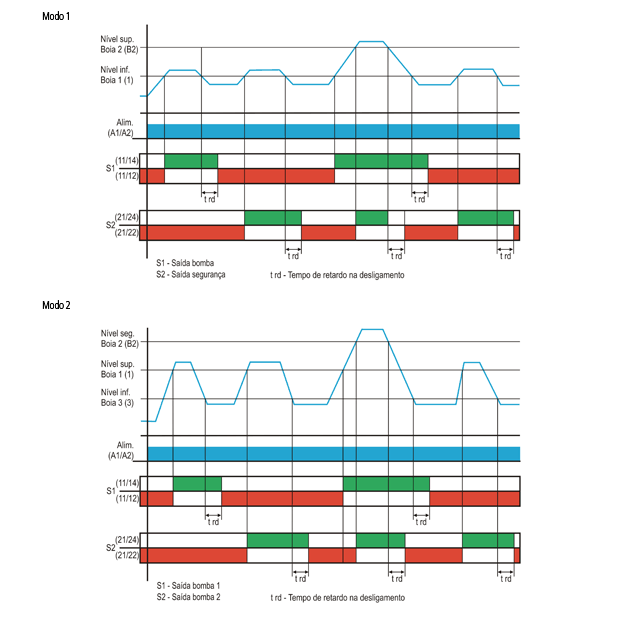 Os relés de nível JPX-126 e DPX-126 podem operar em dois modos distintos, sendo eles com duas ou três boias, configurados por chave no frontal do aparelho. O funcionamento de cada modo está descrito a seguir.