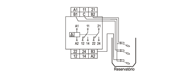 MODO 2 - Com três boias, sendo boia 1 (B1) para controle do nível superior, boia 2 (B2) para segurança de transbordamento e boia 3 (B3) para controle do nível inferior.