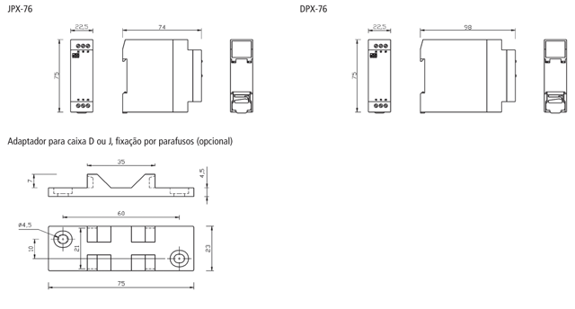 Trilho DIN 35 mm ou parafusos (com acessório opcional para caixas J e D) |