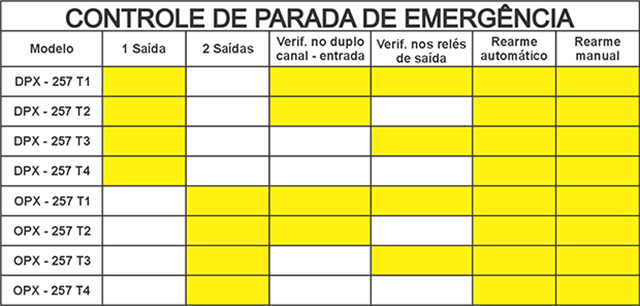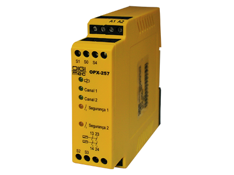 Os relés de segurança para parada de emergência tipos DPX-257 e OPX-257 foram desenvolvidos pela DIGIMEC para garantir a segurança em sistemas de paradas de emergência em diversas máquinas e equipamentos. Utilizando juntamente com dispositivos de emergência como, sensores magnéticos, cortinas de luz, e outros, visa atender a NR-12, tendo como princípio de projeto os requisitos constantes nas normas: