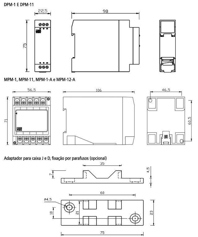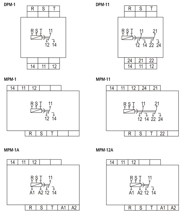 Os relés possuem tempos ajustáveis para retardo no ligamento ou inibição (ambos selecionáveis via cursor frontal) e outro para retardo no desligamento. Os modelos MPM-1-A e MPM-12-A possuem duas entradas, sendo uma para alimentação auxiliar e outra para entrada de medição.