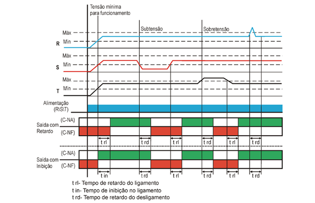 Com a rede trifásica ligada ao aparelho, os relés de saída do supervisor serão energizados (função com tempo de inibição). Caso seja selecionado tempo de retardo no ligamento, os relés serão energizados após o período definido via frontal e assim permanecerão até que ocorra subtensão ou sobretensão. Caso o valor de alimentação da rede diminua ou aumente até valores individualmente ajustáveis no frontal do aparelho, os relés de saída passarão para o estado de repouso após o tempo ajustado no retardo de desligamento.